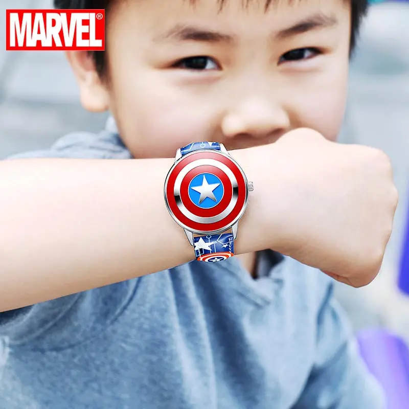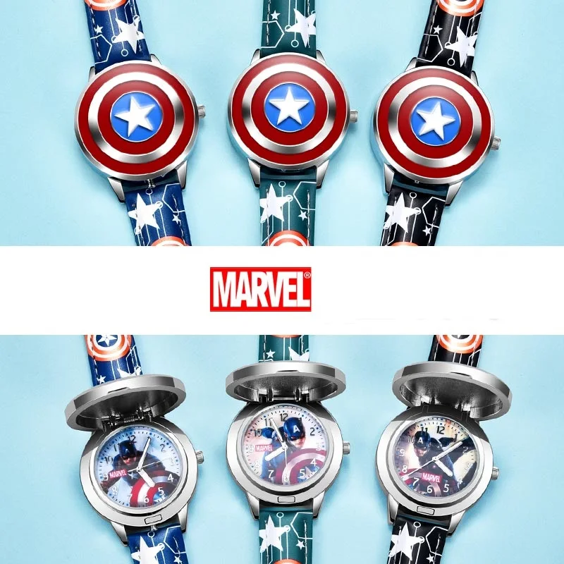| Disney Super Hero Marvel Avengers Captain America Child Leather PU Waterproof Children Quartz Flip Metal Case Watches Boys Clock |